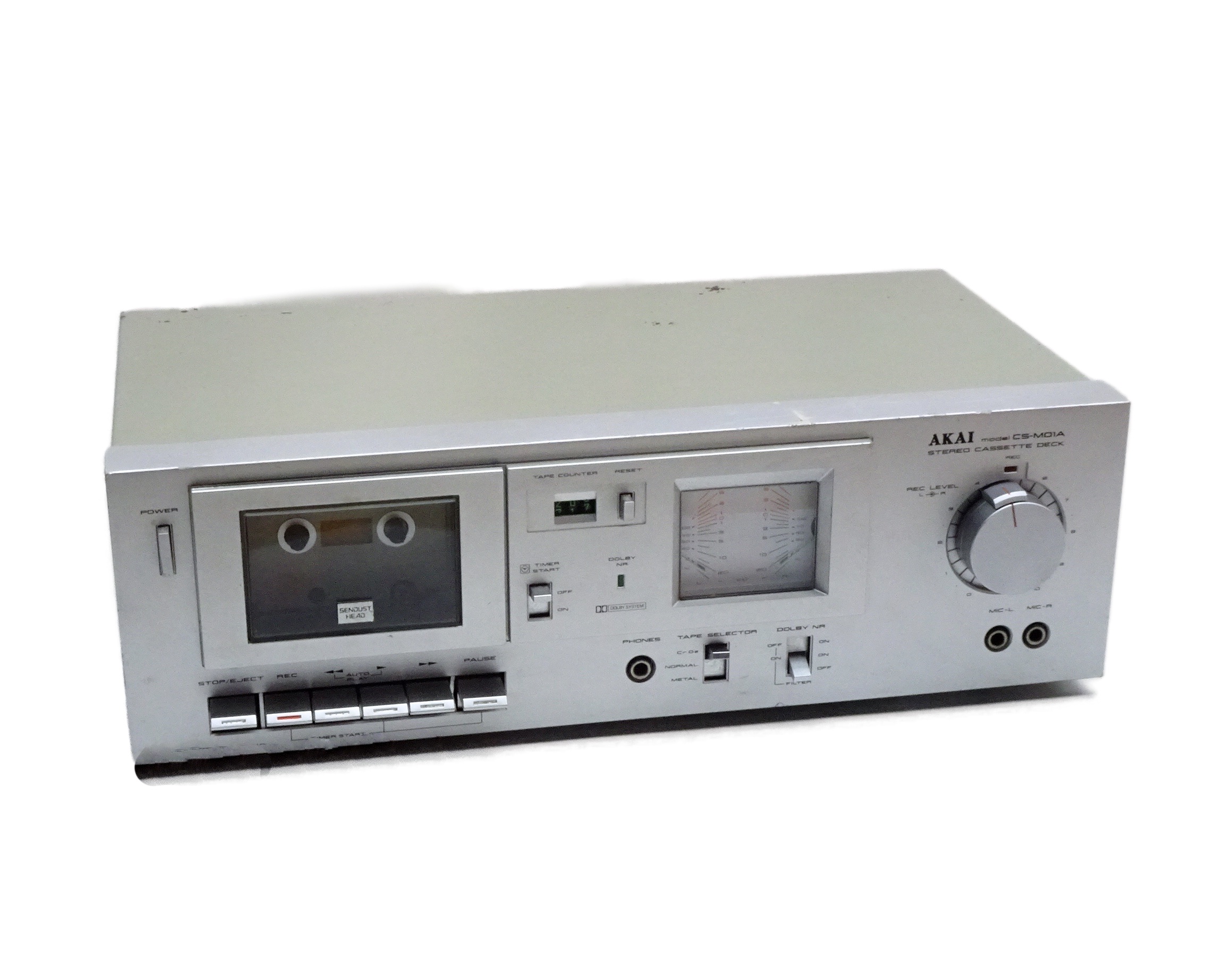 The AKAI CS-M01 is basic cassette deck from the early 80ties. It comes with Dolby noise reduction and two large backlit VU meters in the front panel. These are good sounding units, just focused on the main functions, playing and recording, with no special features like title skip or memory.