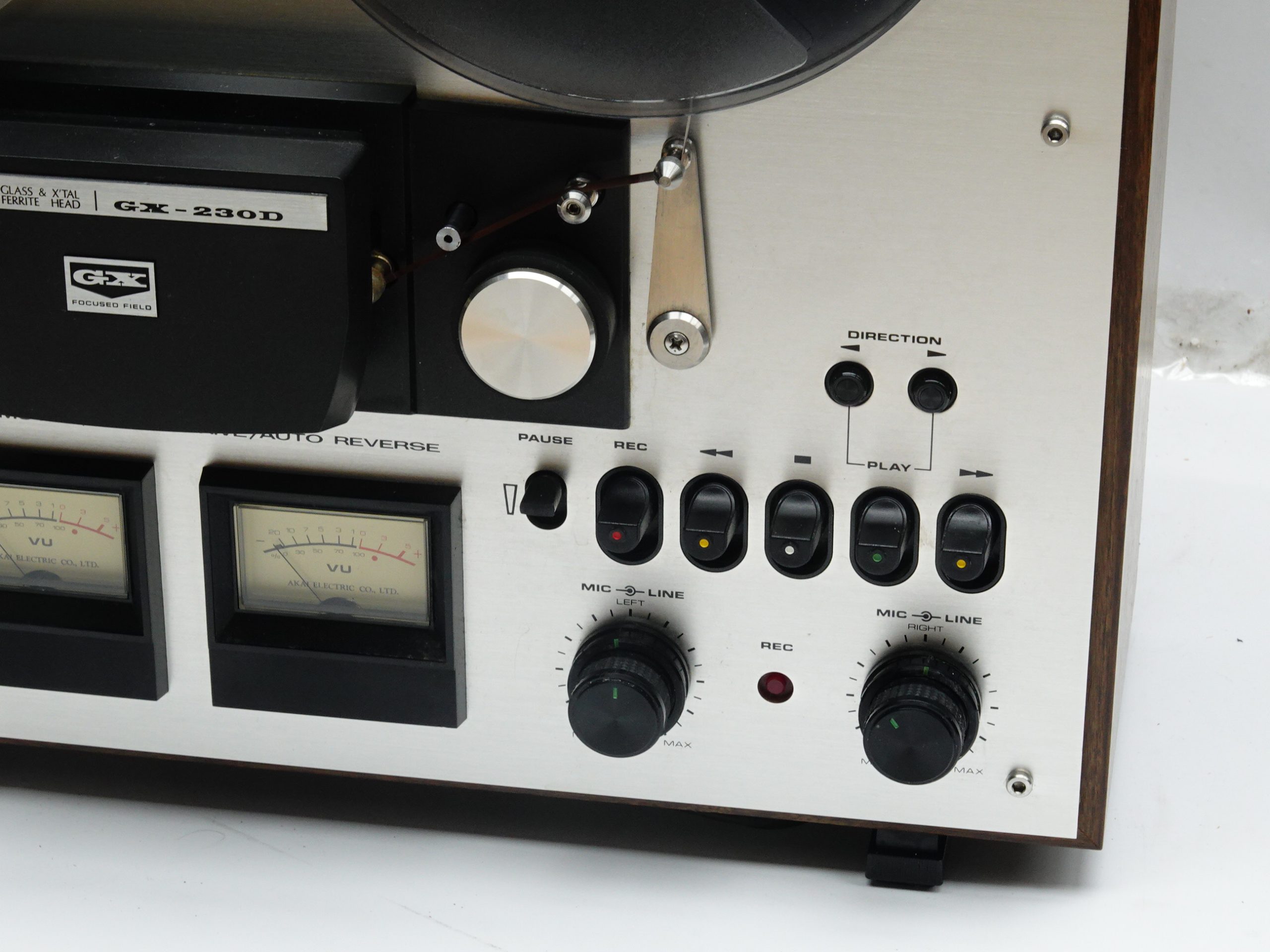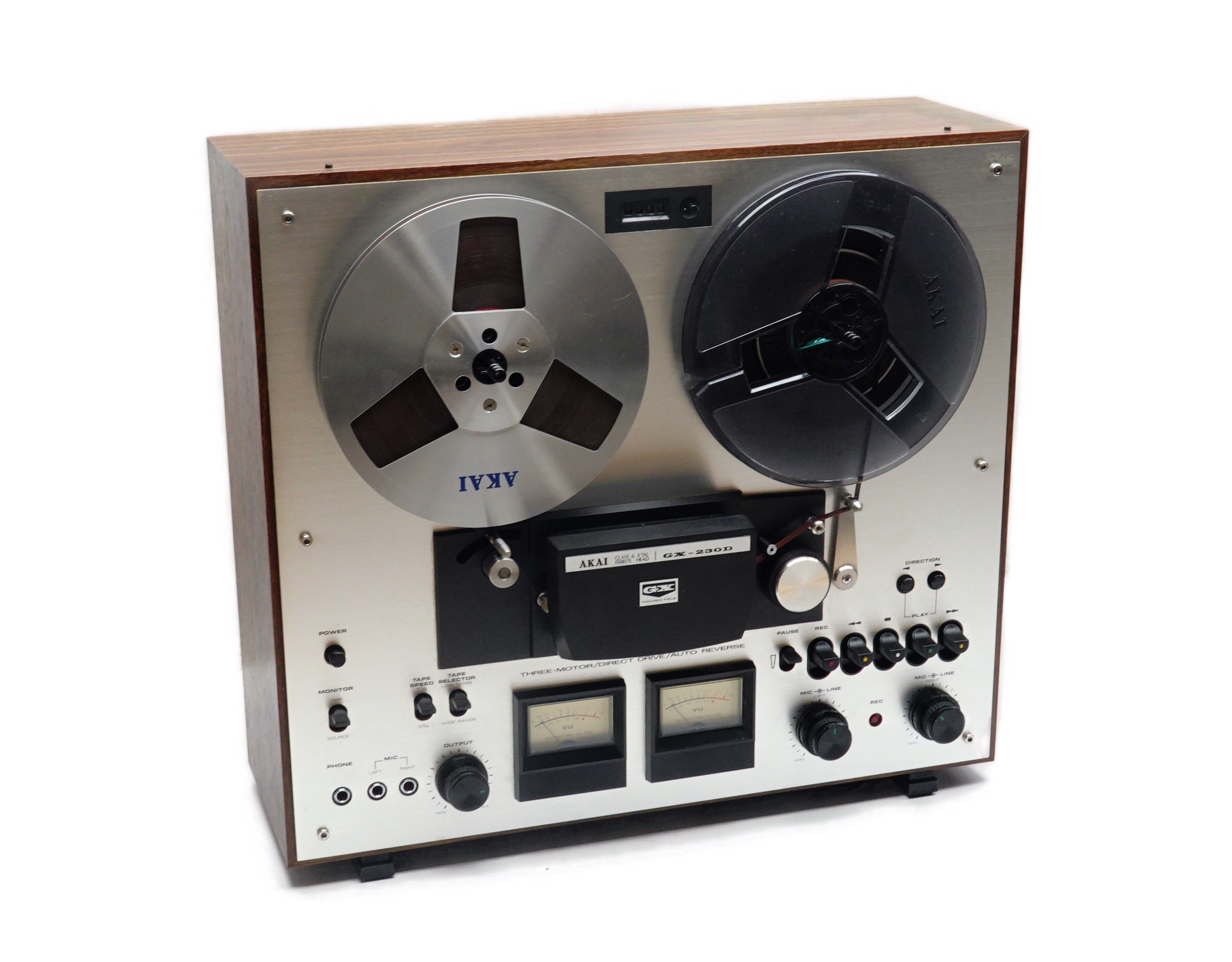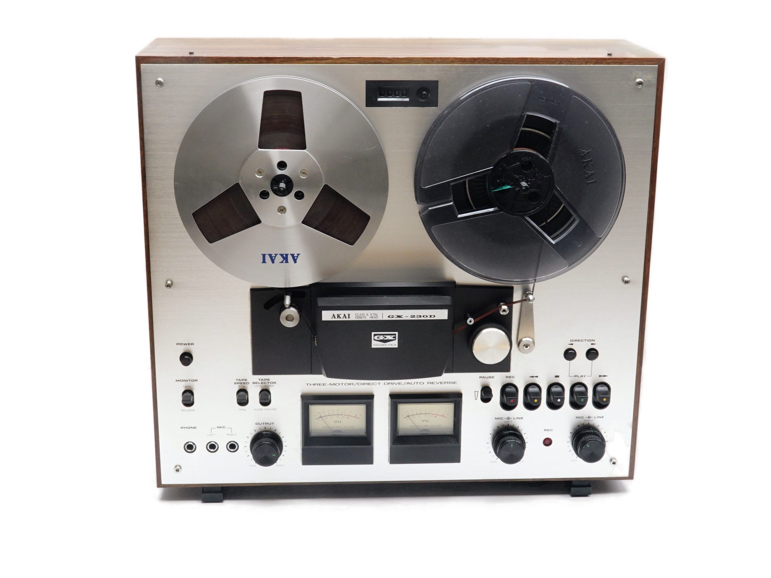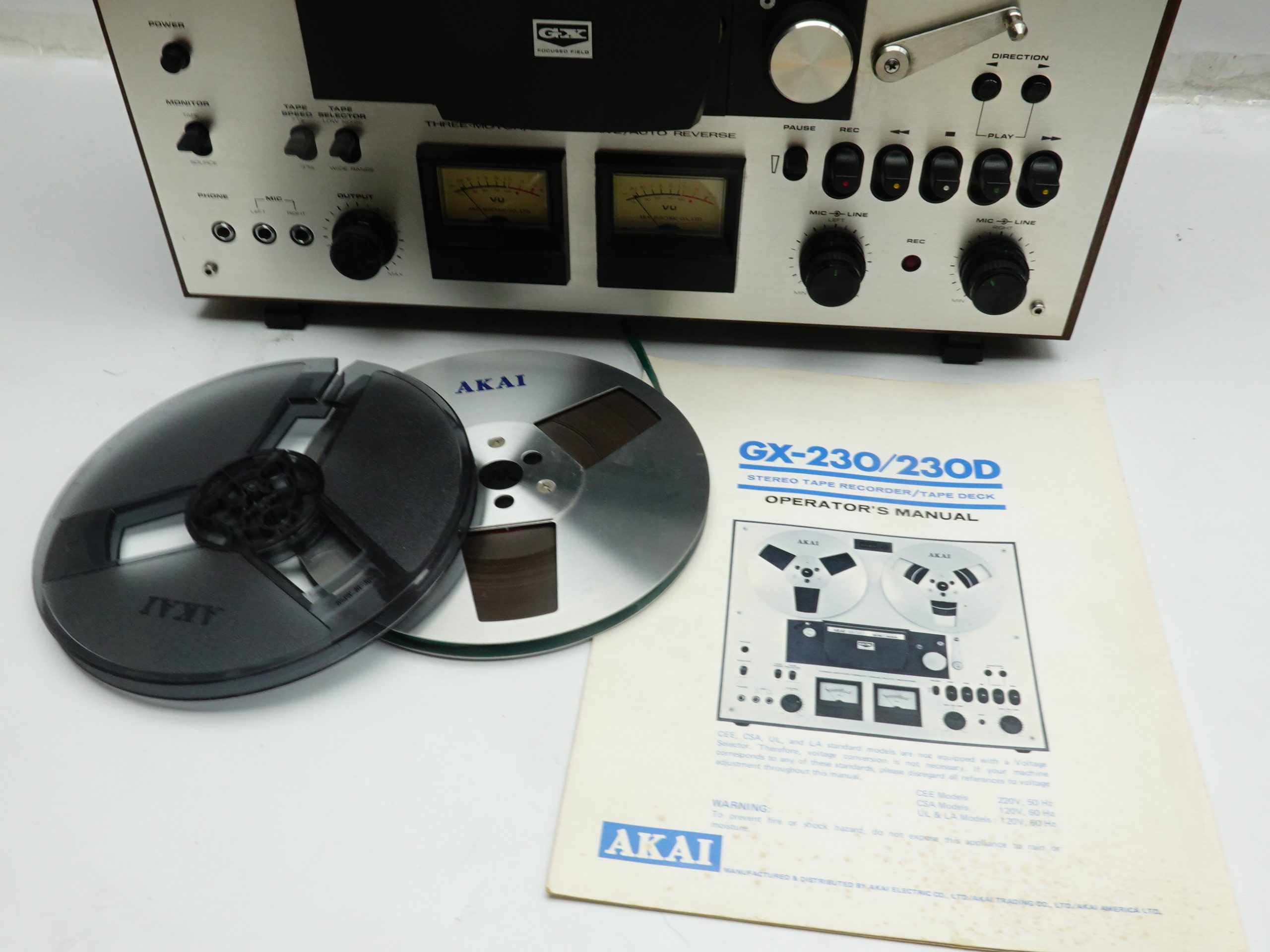 The GX-230 is a direct drive, 3 motor reel to reel. It has 3 heads and auto reverse function. It plays and records at either 3 3/4 ot 7 1/2 IPS – on both sides. These decks from AKAI are really well built. It comes in a solid wooden case and with a thick aluminium fascia. Evherything on it feels solid and well made. No wonder that it weighs over 15KGs, even for just being a 7″ deck.